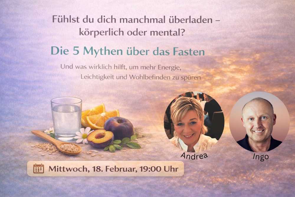 In diesem kostenlosen Live-Seminar zeigen dir Andrea Lienemann (zertifizierte Fastenleiterin mit über 30 Jahren Erfahrung) und Ingo Lienemann, warum sich so viele Menschen energielos, aufgebläht und erschöpft fühlen – und was du dagegen tun kannst.