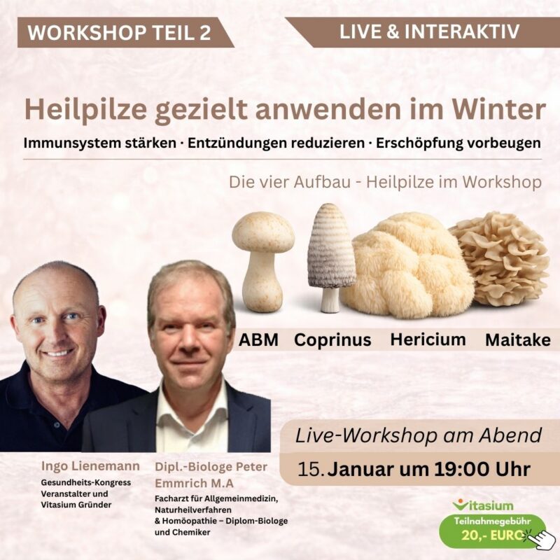 In diesem Workshop zeigt dir Peter Emmrich, wie du die nächsten vier Heilpilze – ABM, Coprinus, Hericium und Maitake – gezielt einsetzt, um Immunsystem, Stoffwechsel und Nerven zu stärken.