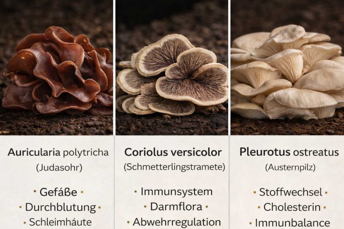 Auricularia (Judasohr), Coriolus versicolor (Schmetterlingstramete) und Pleurotus ostreatus (Austernpilz).
