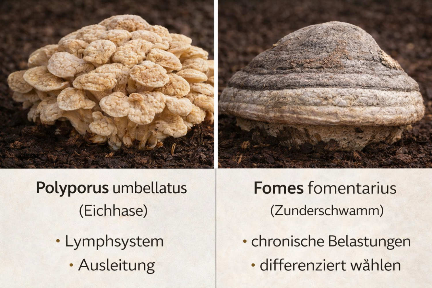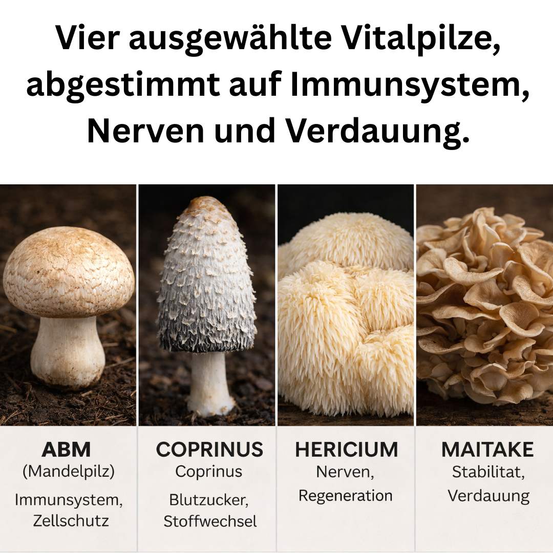 Reishi, Chaga, Cordyceps, ABM, Hericium, Maitake, Auricularia, Coriolus, Pleurotus, Polyporus und Zunderschwamm.