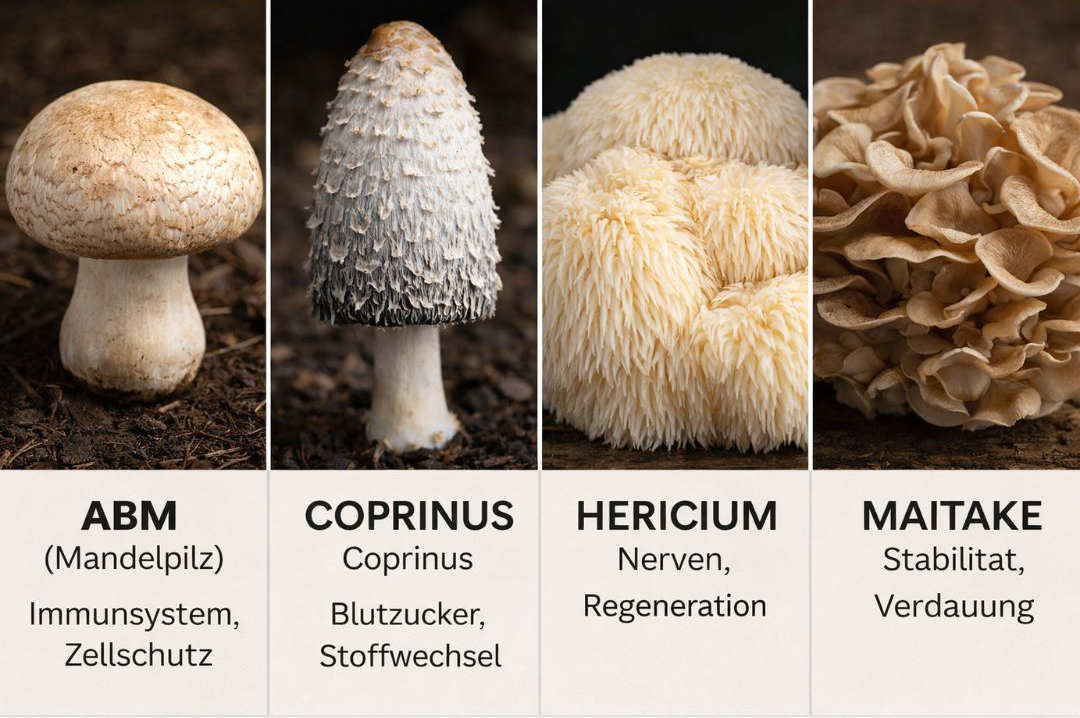 darunter ABM (Mandelpilz), Coprinus comatus, Hericium (Igelstachelbart) und Maitake.