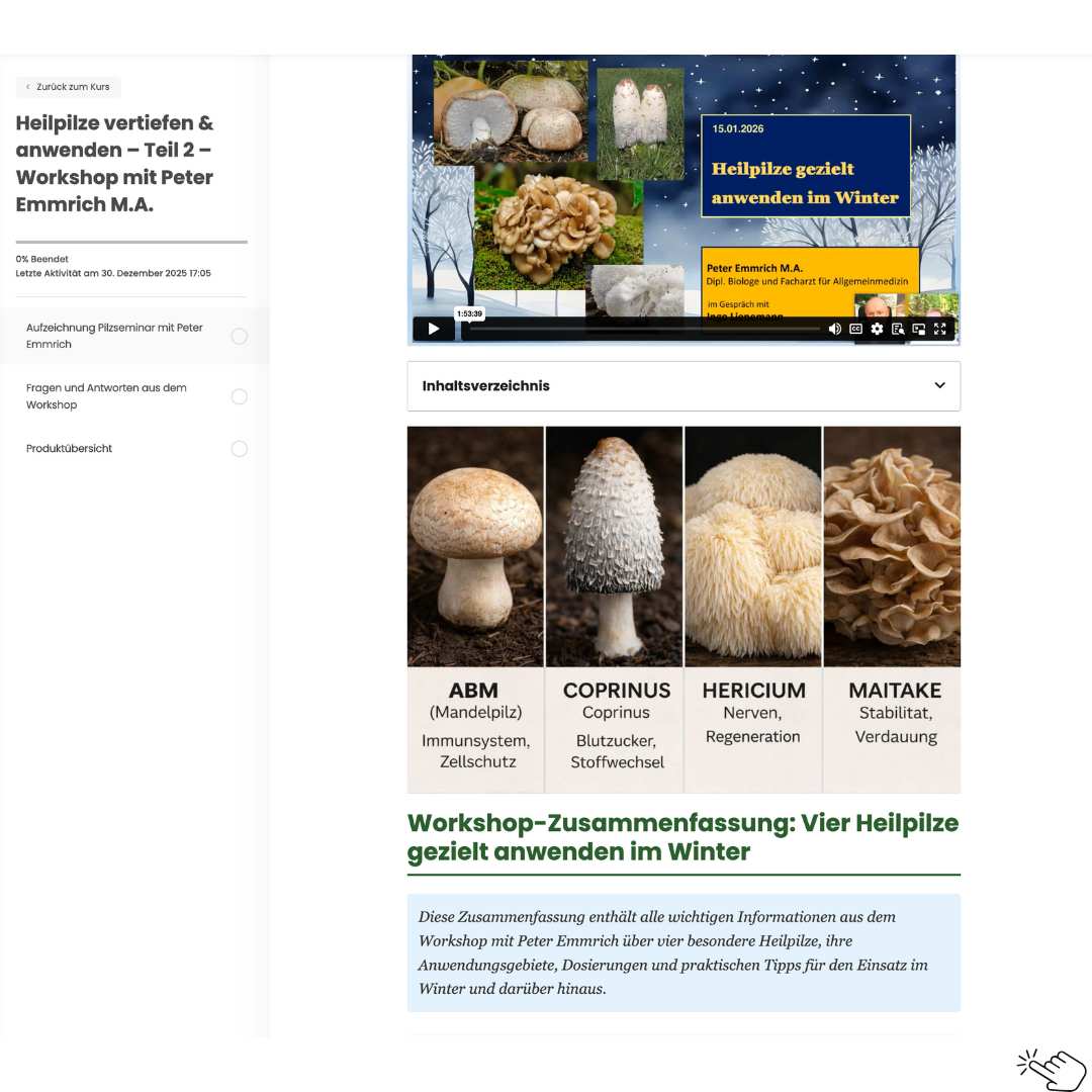 In diesem Live-Workshop erhältst du einen verständlichen Überblick über die wichtigsten Heilpilze – praxistauglich, klar erklärt und mit vielen Beispielen aus der Anwendung.